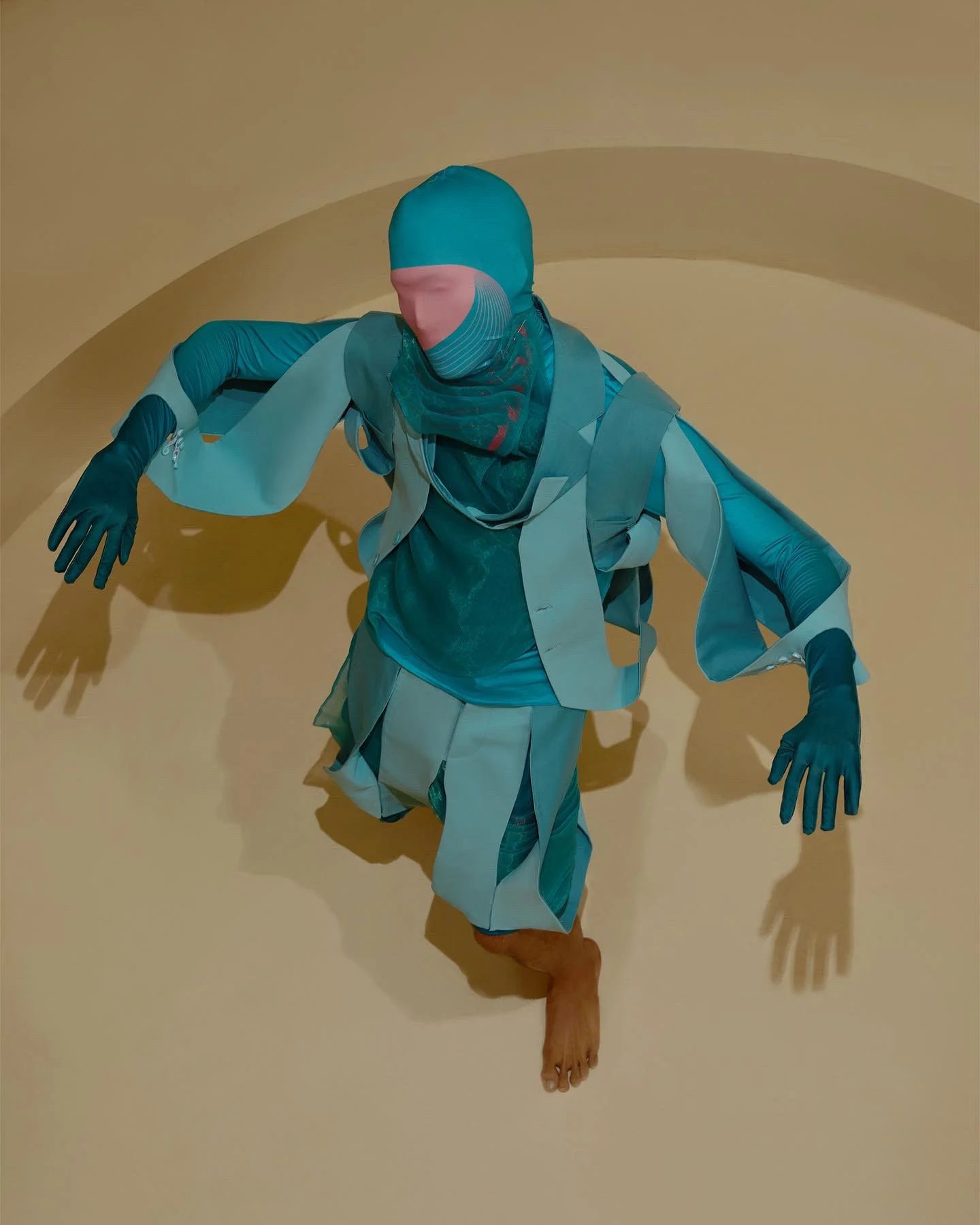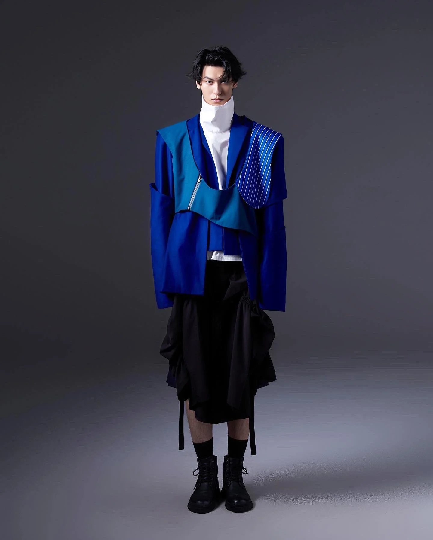 我的设计灵感来源于汉画像砖,是在建筑使用的砖块上雕刻画像,服装结构方面做了多处的可拆卸设计,强调重叠穿搭并融入了休闲元素。作品名称为《㵘》,原意是水势浩大的意思,让人联想到蓝色系与数字的颜色,与灵感来源相契合,给人气势磅礴但又不厚重的现代感,同时很符合数字服装的设计风格。